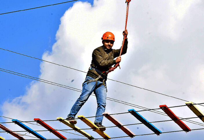 Safety while doing Skywalk in Pondicherry is ensured using safety gear with proper guidance and instructions.